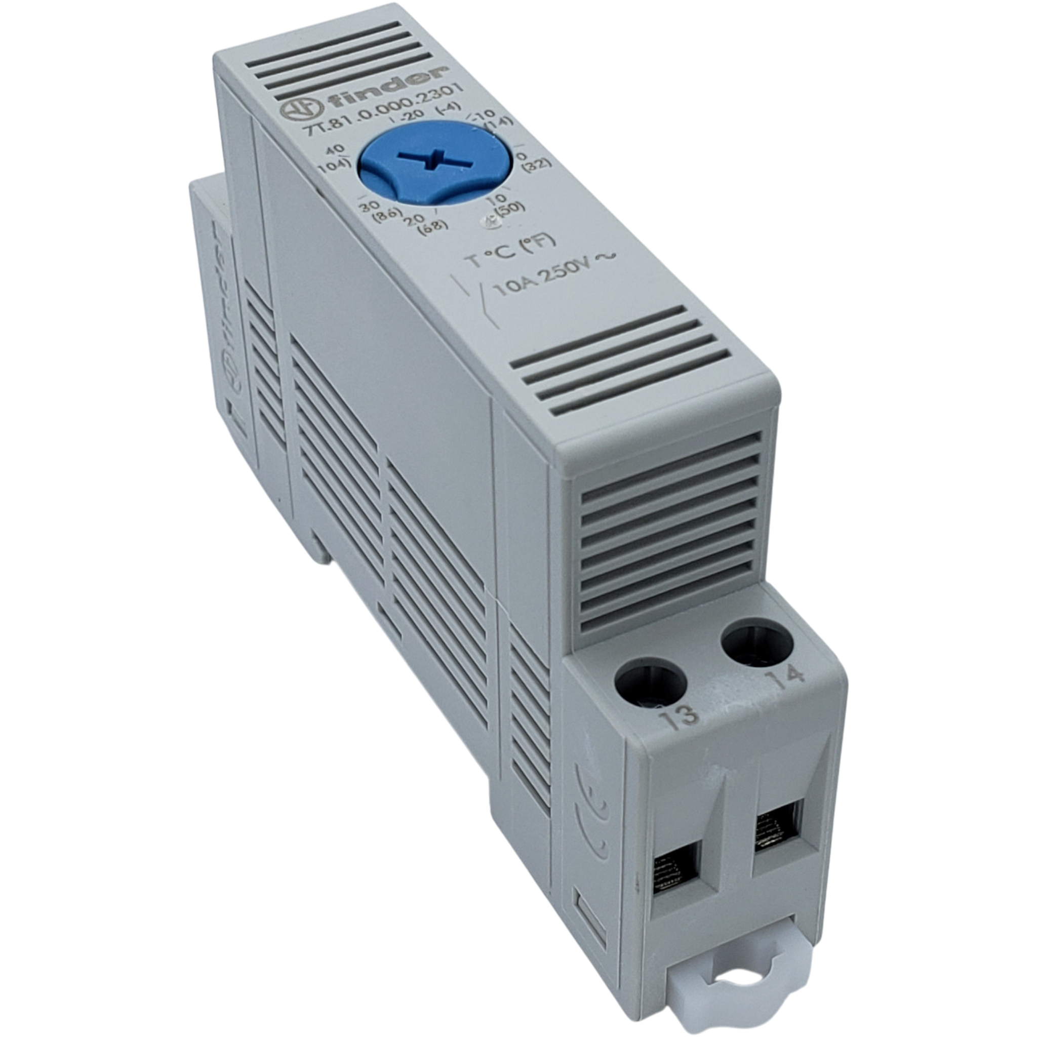 The Finder 7T.81 panel thermostat is a compact DIN rail thermostat designed to control fans, blowers, and ventilation equipment inside electrical panels and enclosures. This model is made for ventilation control, which means the contact closes when the panel temperature rises above the set temperature and opens again when the temperature falls below it.
